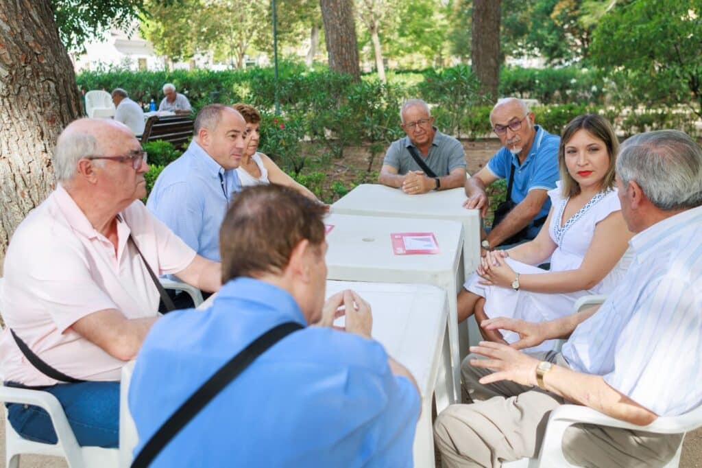 Los candidatos socialistas al Congreso y al Senado por Albacete, Emilio Sáez y Amparo Torres, respectivamente, han mantenido este lunes, en el parque Abelardo Sánchez, un encuentro con integrantes de la Unión Democrática de Pensionistas de C-LM ‘Don Quijote’ (UDP), encabezada por Ramón Munera.